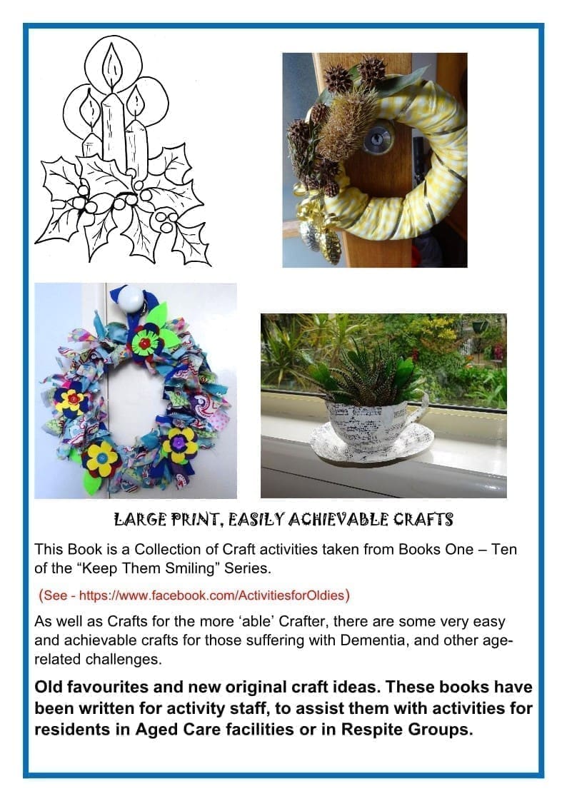 Old favourites and new original craft ideas. The books have been written for Activity Staff, to assist them with Activities for residents in Aged Care Facilities or in Respite Groups. As well as Crafts for the more ” able” Crafter there are some very easy and achievable crafts for clients with Dementia and other age related challenges